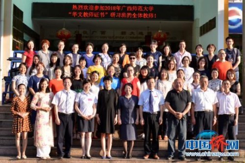 中国侨网桂林7月11日电(吕芳)6月23日至7月10日,2018年广西师范大学“华文教师证书”研习班在桂林举办,来自亚洲、美洲、欧洲、大洋洲四大洲18个国家的45名华文教师参加了培训。